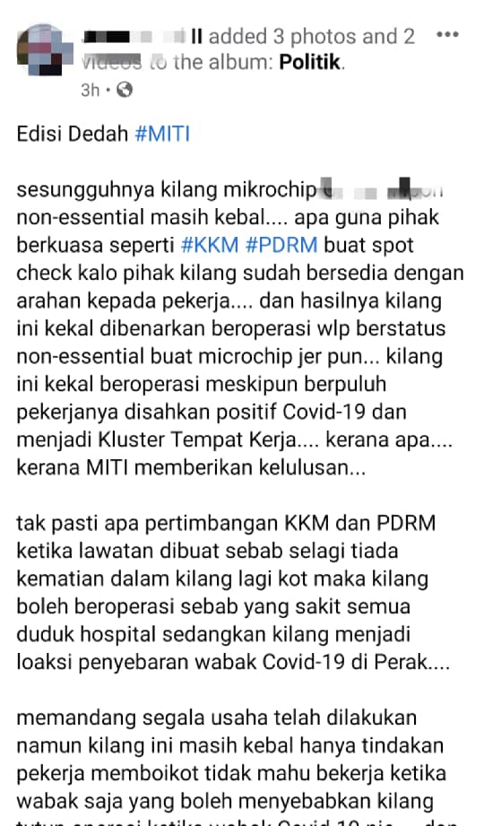 Sejak beberapa hari lalu tular di media sosial mengenai pertikaian beberapa pihak yang mendakwa kilang berkenaan masih kebal beroperasi meskipun merekodkan kes positif Covid-19.