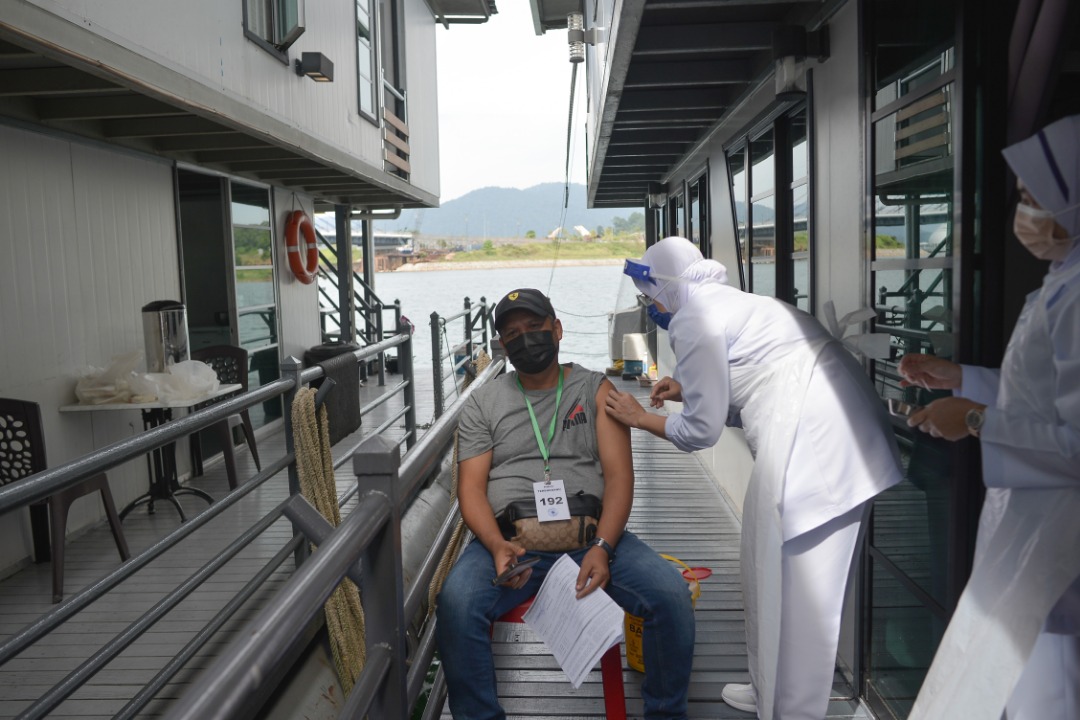 HULU TERENGGANU: Proses vaksinasi Covid-19 terhadap 300 penggiat pelancongan di Tasik Kenyir di sini, mencatatkan kelainan apabila julung kali diadakan di rumah bot.
