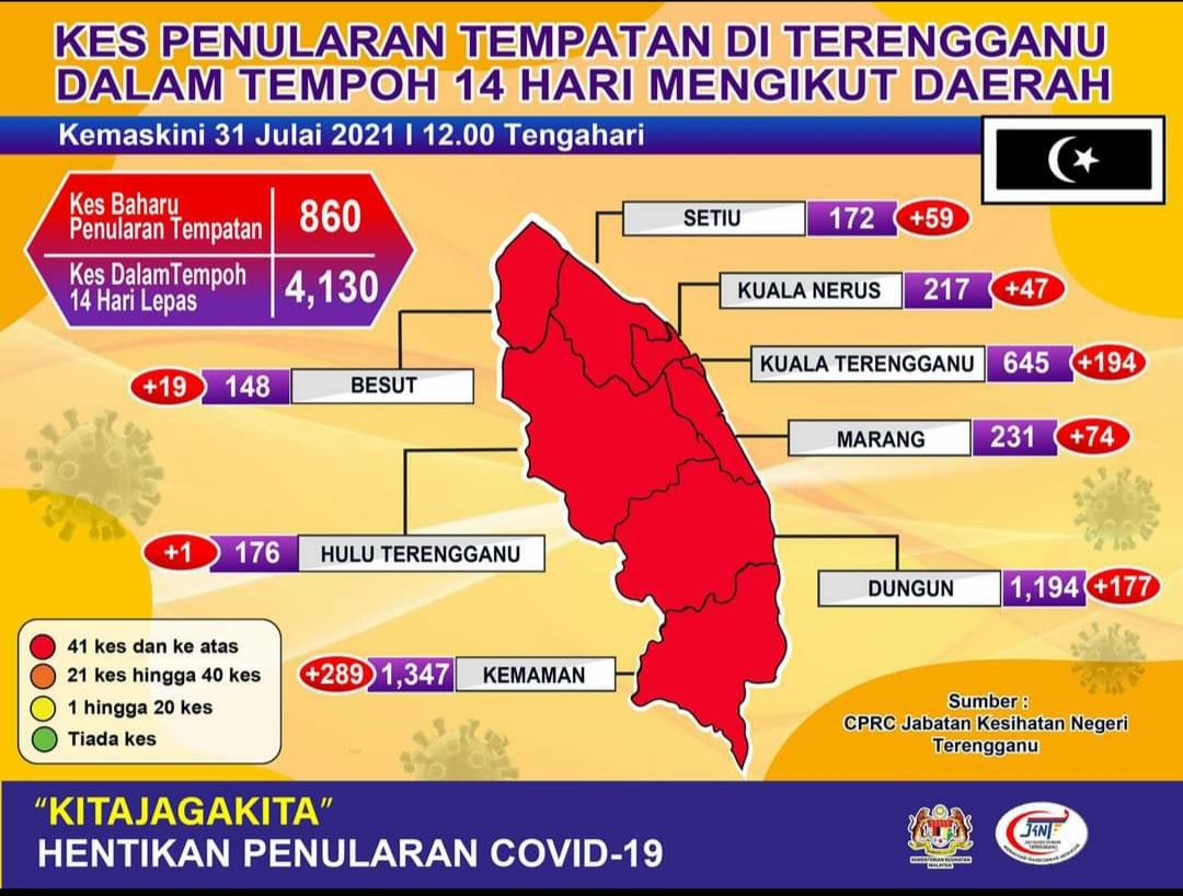 Peningkatan itu turut menjadikan kes Covid-19 di seluruh lapan daerah di Terengganu kini zon merah sejak sembilan hari lalu.