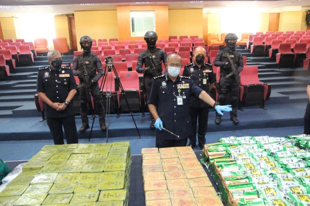 Dalam serbuan itu, polis berjaya membongkar stor di tiga rumah berbeza dan merampas 1,294 bungkusan dadah membabitkan 431 bungkusan dadah jenis syabu dan 863 slab 2 serta 2,000 biji pil eramin 5 dengan jumlah berat keseluruhan 763.34 kilogram.