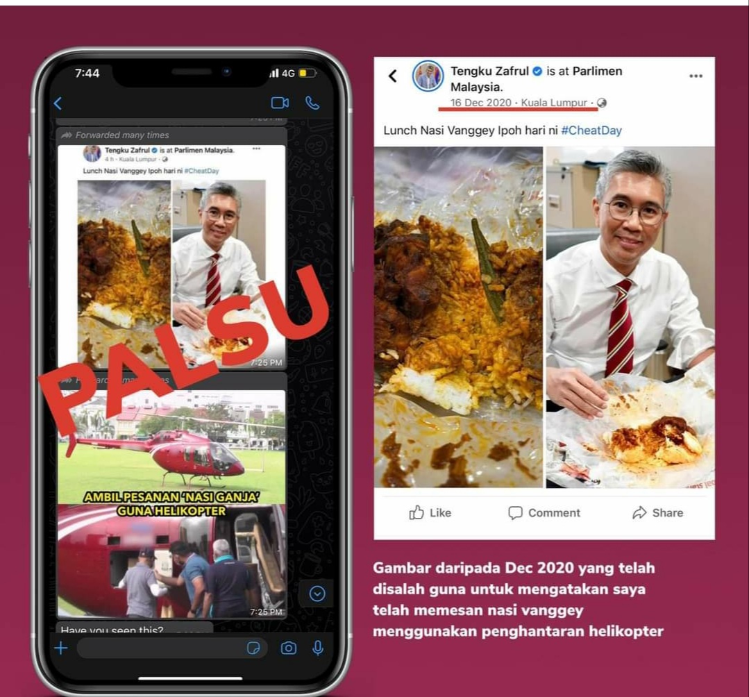 “Lucu bila terima forwarded WhatsApp message kononnya saya order nasi ganja Ipoh guna helicopter. Mereka guna gambar lama saya makan nasi vanggey pada Dis 2020, tapi crop tarikh.