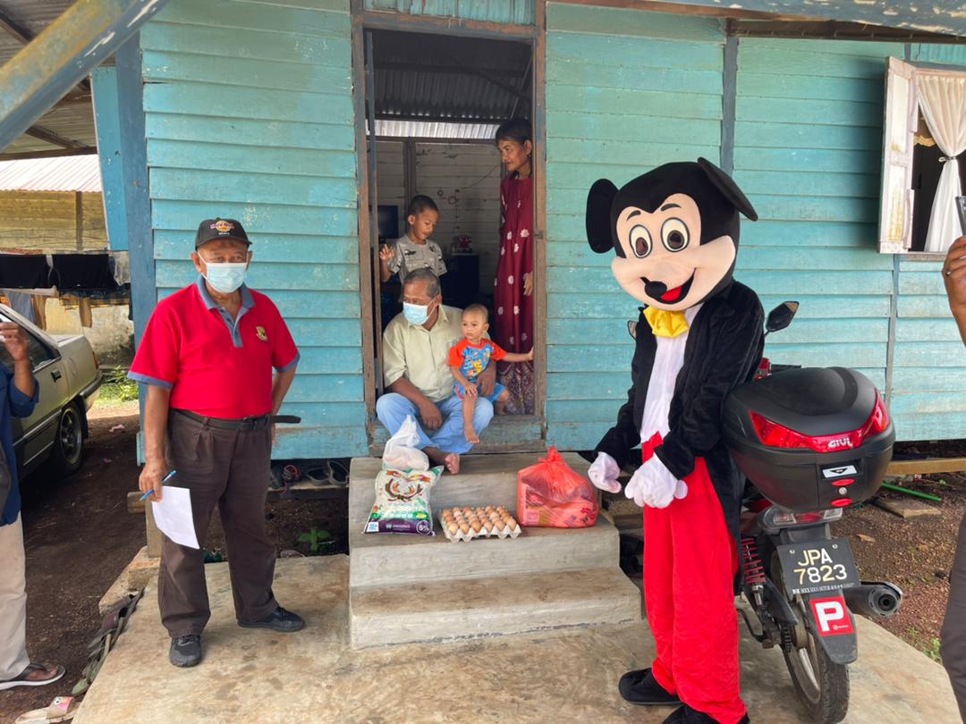 PONTIAN: Kehadiran maskot Mickey Mouse menceriakan penyampaian bakul makanan anjuran Persatuan Kebajikan Masyarakat Insani Kasih (I Kasih) di Kampung Parit Dato Onn di sini, baru-baru ini.