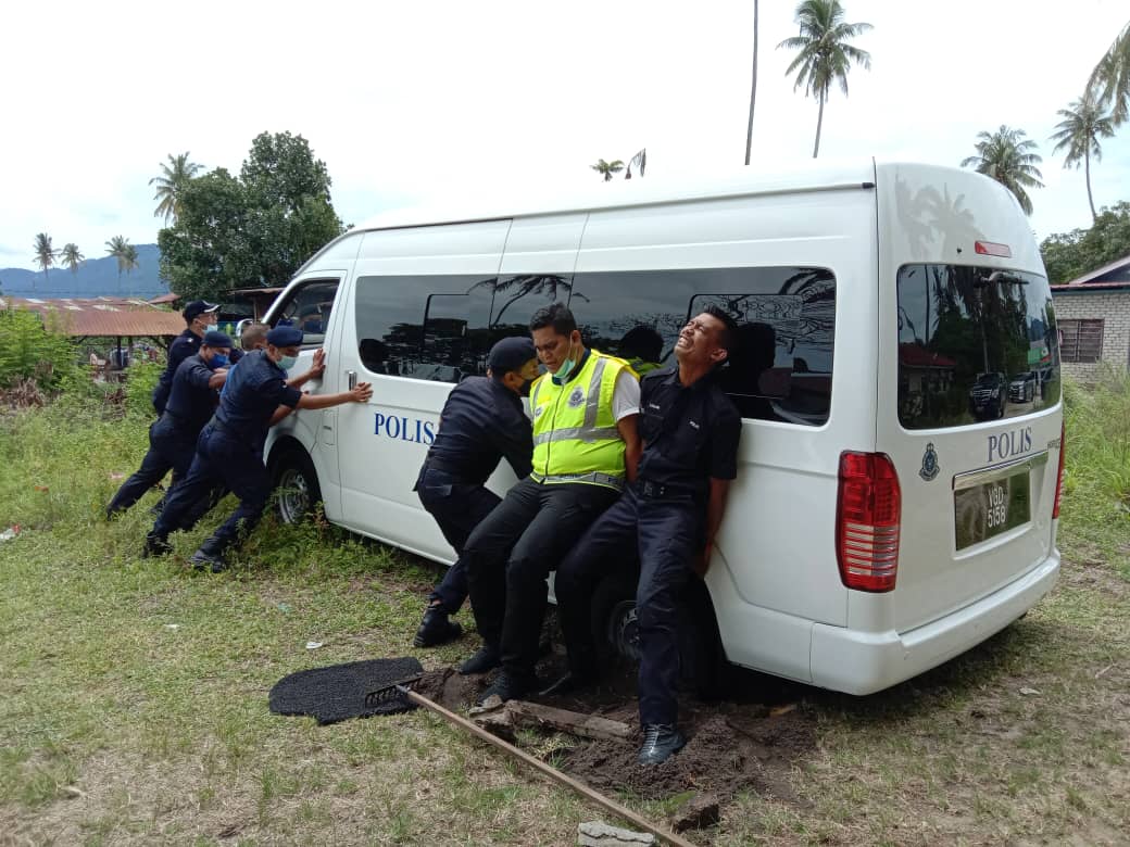Van polis yang membawa sekumpulan skuad AMANITA Ibu pejabat Polis Daerah (IPD) Barat Daya tu bagaimanapun tersekat dipercayai kerana mendapan tanah sebelum terpaksa ditolak beramai-ramai.