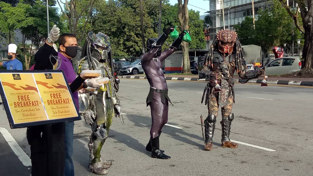 Bagaimanapun, kemunculan ketiga-tiga mereka bukanlah untuk ‘berperang’ sesama sendiri, namun berganding bahu menyerahkan sumbangan sarapan pagi percuma kepada pengguna jalan raya yang melalui laluan berkenaan.