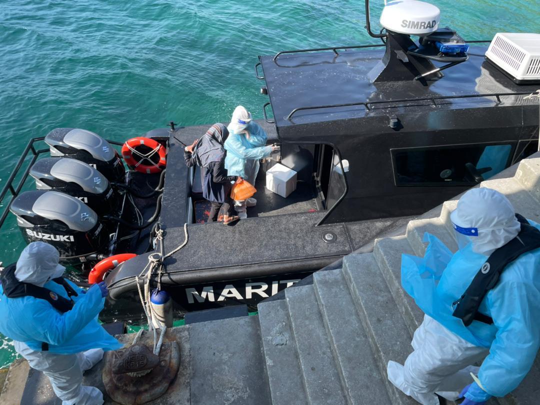 MERSING: Agensi Penguatkuasaan Maritim Malaysia (Maritim Malaysia) Johor menerusi Zon Maritim Mersing membantu membawa keluar tiga pesakit Covid-19 dari Pulau Aur ke Jeti Syahbandar, di sini semalam.