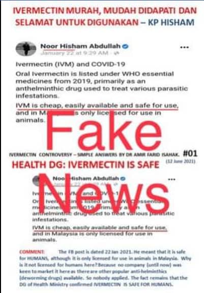 “Artikel yang bertajuk ‘Ivermectin murah, mudah didapati dan selamat untuk digunakan – KP Hisham’ merupakan berita palsu dibuat pihak tertentu,” katanya menerusi kenyataan di sini.
