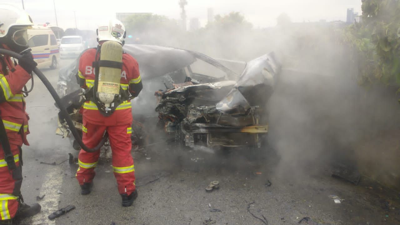 CYBERJAYA: Seorang maut manakala seorang lagi cedera selepas terperangkap dalam sebuah kereta yang musnah terbakar dalam kejadian di Putrajaya Link, menghala Tol Putrajaya. di sini pagi tadi.