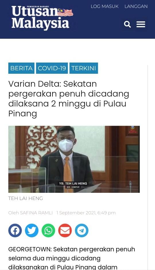 Ahli Dewan Undangan Negeri (ADUN) Komtar, Teh Lai Heng berkata, pihaknya mendapati ketika ini banyak mesej suara terdiri daripada beberapa bahasa telah tular dalam media sosial mendakwa Pulau Pinang akan dikenakan ‘lockdown’ 2.0 mulai esok.