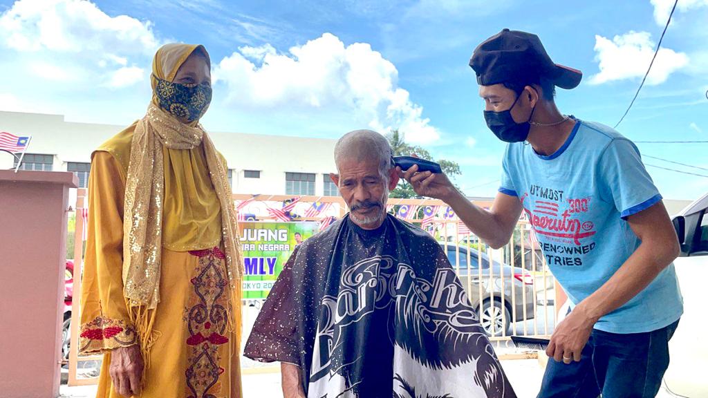 Romly Mat, 70, mencukur rambut di halaman rumahnya di Taman Emas, Beseri, di sini hari ini iaitu sehari selepas atlet negara itu menghadiahkan pingat emas untuk negara dalam acara lompat jauh T20 (masalah pembelajaran).