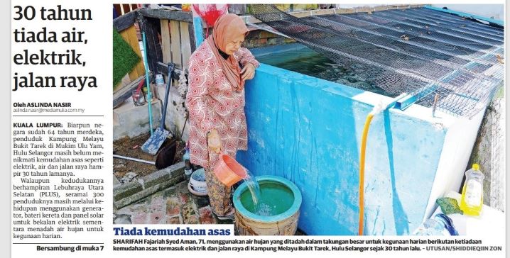 Utusan Malaysia hari ini melaporkan penderitaan dihadapi penduduk kampung berkenaan yang berdepan masalah ketiadaan bekalan air dan elektrik serta jalan raya sejak 30 tahun lalu.