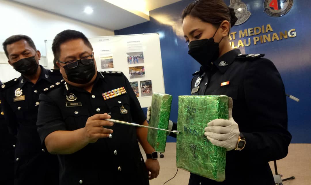 “Di rumah itu, polis menemukan 12 ketulan ganja seberat 12.4 kilogram, tiga paket syabu (1.8 kg), satu ketulan heroin base (375 gram) dan serbuk kafein (6.6 kg) yang mana nilai keseluruhan rampasan dianggarkan RM146,774,” katanya dalam sidang akhbar di Ibu Pejabat Polis Kontinjen (IPK) Pulau Pinang, di sini hari ini.