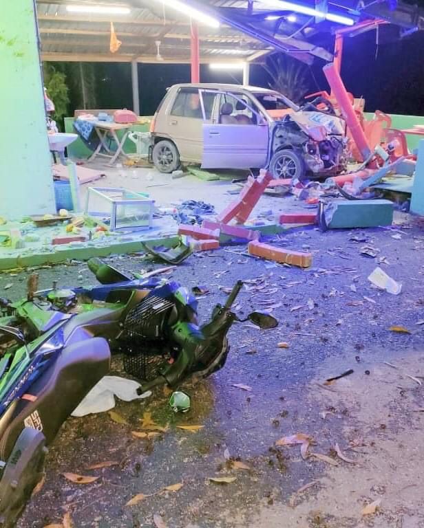 “Ia kemudian terbabas ke tepi jalan lalu melanggar sebuah motosikal yang diletakkan di hadapan kedai makan tersebut serta menyusur masuk dan melanggar tiang di dalam kedai.