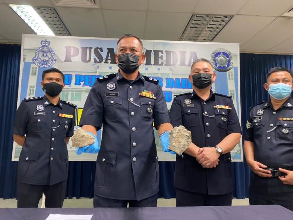 Menurutnya, anggota polis menghampiri suspek selepas melihatnya mengambil sesuatu di dalam motosikalnya dan hasil pemeriksaan, polis menjumpai dua ketul batu di dalam kenderaan tersebut.
