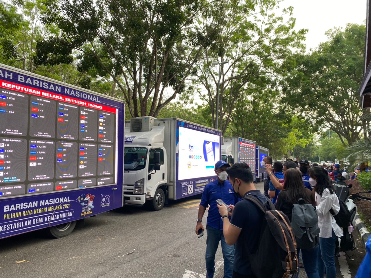 Mereka melihat papan skrin yang menunjukkan perkembangan terkini keputusan penuh 28 Dewan Undangan Negeri (DUN) Melaka. – UTUSAN