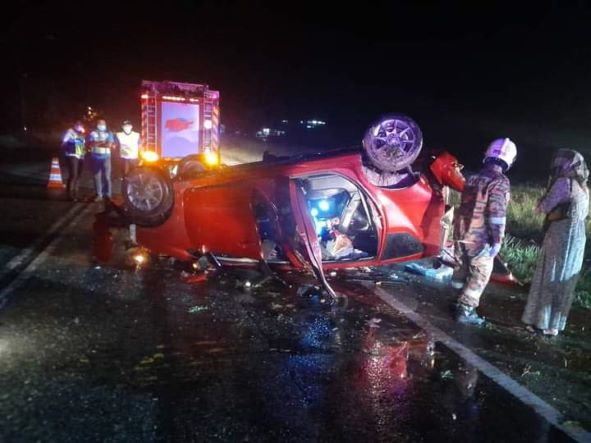 “Kemalangan berlaku ketika cuaca hujan apabila sebuah kereta Perodua Alza yang dipandu oleh Abdul Walid dipercayai hilang kawalan dan terbabas ke kanan jalan lalu terbalik ketika .