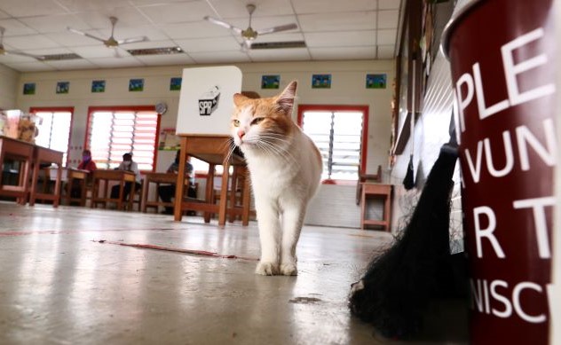 ALOR GAJAH: Seekor kucing bercorak putih dan oren yang dipanggil sebagai ‘pemerhati’ memasuki saluran tiga menggamit suasana petugas Suruhanjaya Pilihan Raya (SPR).