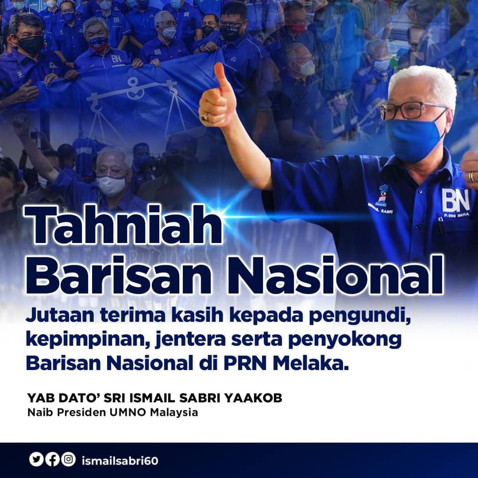 “Tahniah kepada Pengerusi BN, Datuk Seri Dr. Ahmad Zahid Hamidi; Timbalan Pengerusi BN, Datuk Seri Mohamad Hasan; Presiden-Presiden parti komponen BN dan seluruh jentera parti yang menggembleng tenaga membantu memenangkan BN di Melaka.