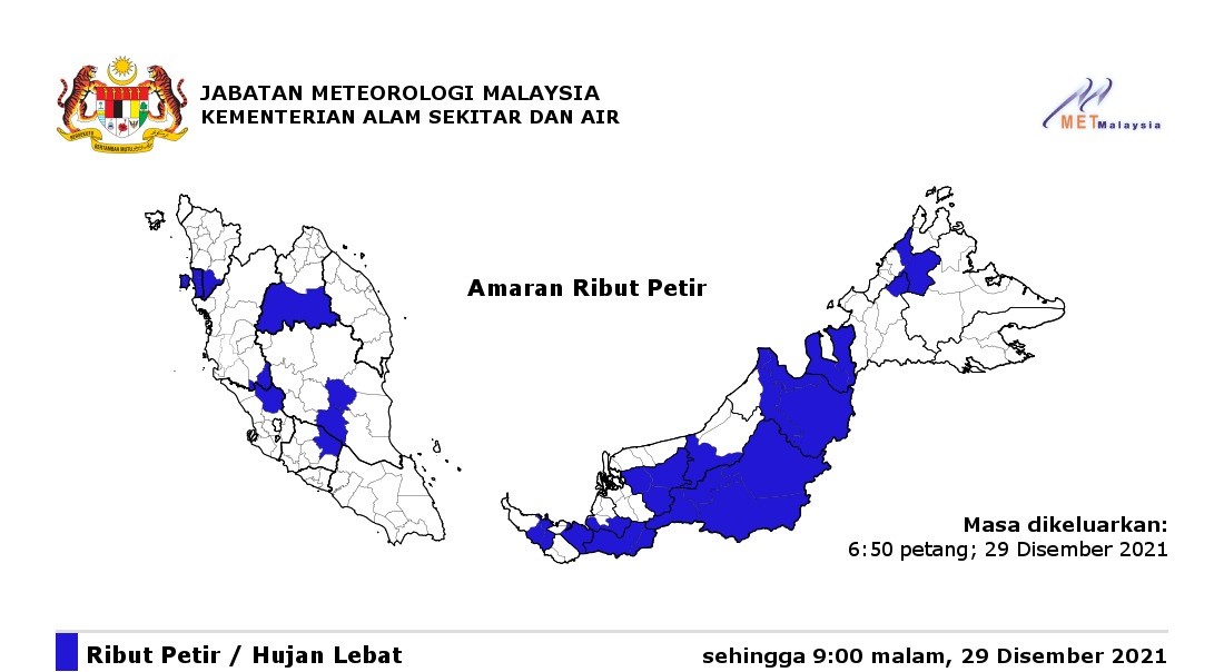PETALING JAYA: Jabatan Meteorologi Malaysia (MetMalaysia) mengeluarkan amaran ribut petir dan hujan lebat di Kedah, Pulau Pinang, Perak, Kelantan, Pahang, Selangor, Negeri Sembilan, Sarawak dan Sabah, sehingga pukul 9 malam ini.