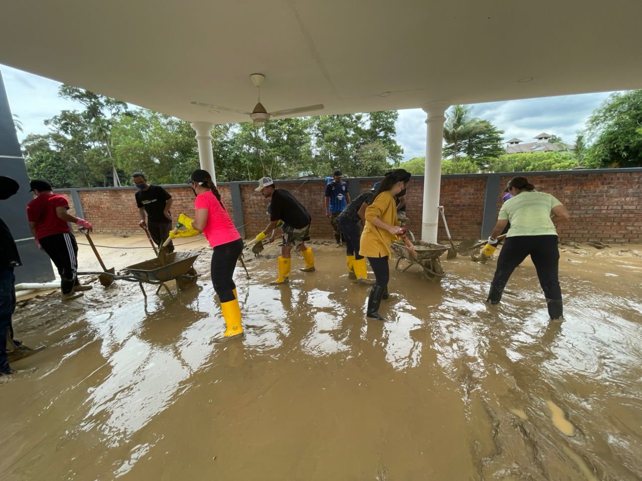 Nina Sabrina bersama suaminya Datuk Jovian Mandagie tanpa protokol bersama-sama dengan sukarelawan yang lain membersihkan lumpur di beberapa rumah di kawasan tersebut yang rosak teruk.