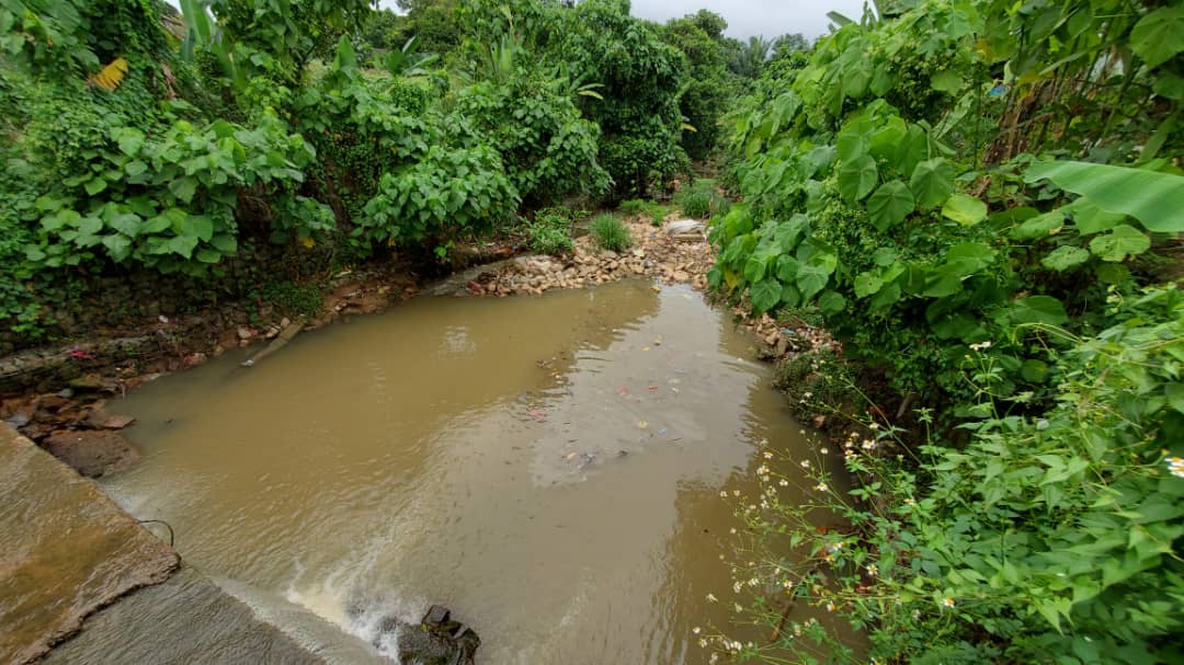 Aliran air di anak Sungai Rinching melalui beberapa kawasan di Kampung Rinching Tengah dan sebuah tempat ternakan ayam di sana.