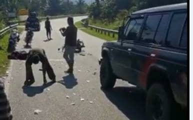 SIK: Seorang penoreh yang dalam perjalanan pulang membawa duit hasil jualan getah sekerap maut selepas motosikal yang ditungganginya berlanggar dengan sebuah kenderaan pacuan empat roda di di Kilometer (KM) 68 Jalan Jeniang-Sik/Pedu dekat Kampung Landai, Belantik di sini hari ini.