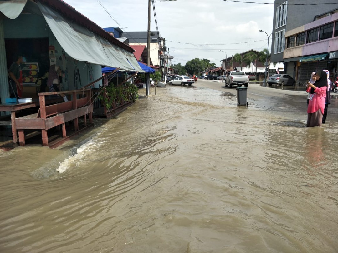 Limpahan air yang sama turut berlaku di Jalan Taib di Bandar Pontian Kecil dari Sungai Pontian Kecil menyebabkan pengguna kenderaan terpaksa mengharungi jalan dipenuhi air.