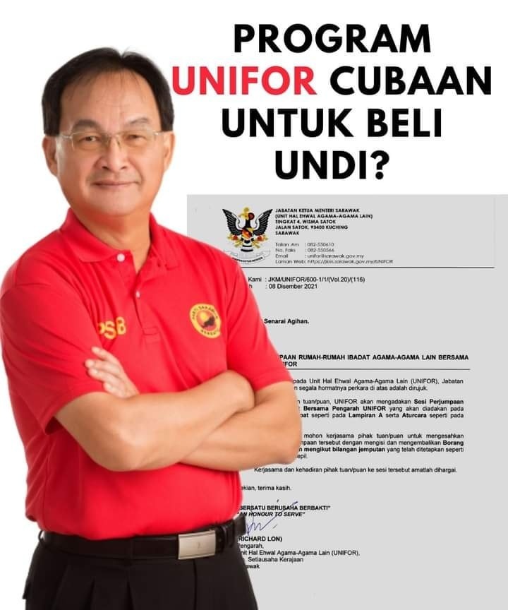 Ia berlaku semasa Pengarah UNIFOR, Richard Lon, dilaporkan mengagih wang kepada gereja-gereja Sidang Injil Borneo (SIB) seperti dilaporkan media tempatan di sini.