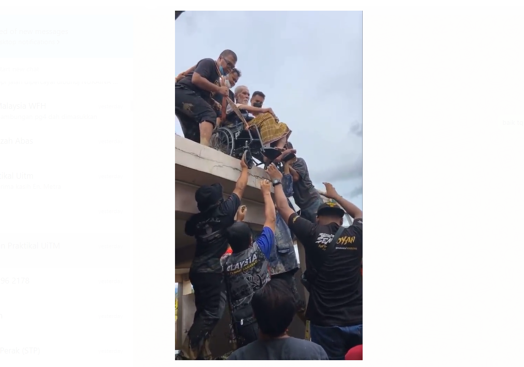 Menerusi sebuah klip rakaman yang disiarkan oleh seorang pengguna aplikasi TikTok, khairulnizam1881 memaparkan sekumpulan golongan belia membantu dua warga emas turun daripada bumbung rumah ibadah selepas terperangkap di dalam bencana banjir.