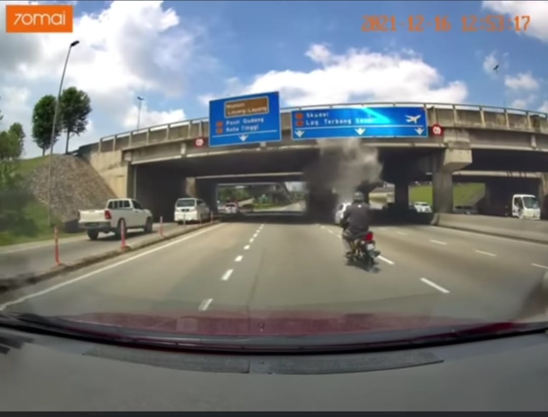 Rakaman insiden yang tular dalam aplikasi media sosial Facebook itu dipercayai dirakam menerusi kamera papan pemuka milik kereta yang berada di belakang motosikal tersebut.