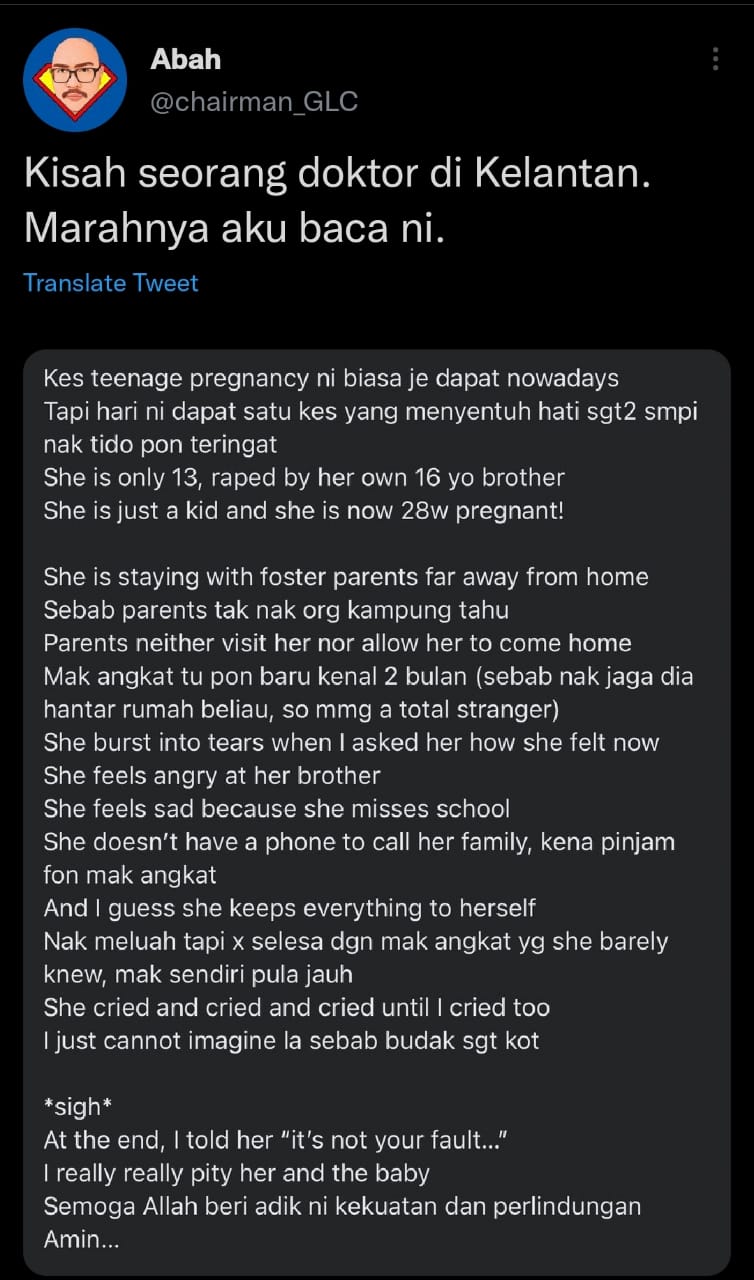 Jelas doktor tersebut, gadis yang hamil 28 minggu itu meluahkan perasaan marah kepada abangnya dan sedih kerana tidak boleh menjalani sesi persekolahan seperti biasa seperti rakan sebayanya.