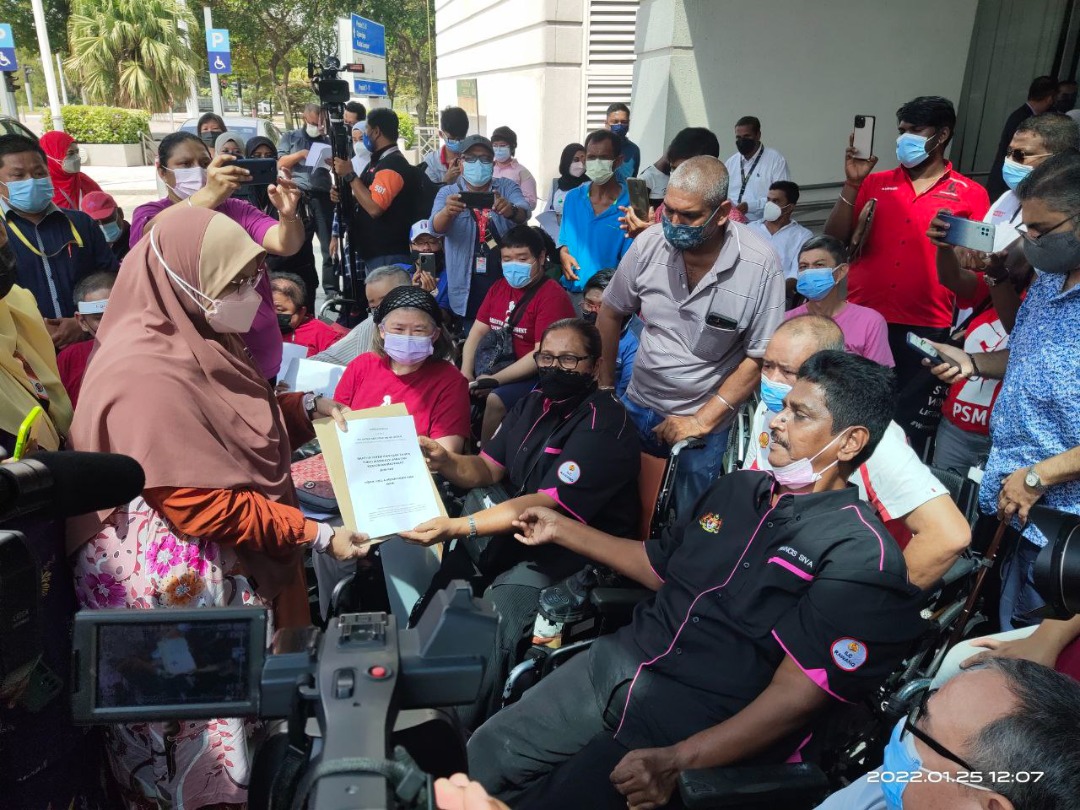 Sebelum itu, kira- kira 50 individu OKU dari seluruh negara mewakili beberapa persatuan berkumpul di pekarangan bangunan kementerian itu untuk menyerahkan memorandum kepada Menterinya, Datuk Seri Rina Mohd. Harun.
