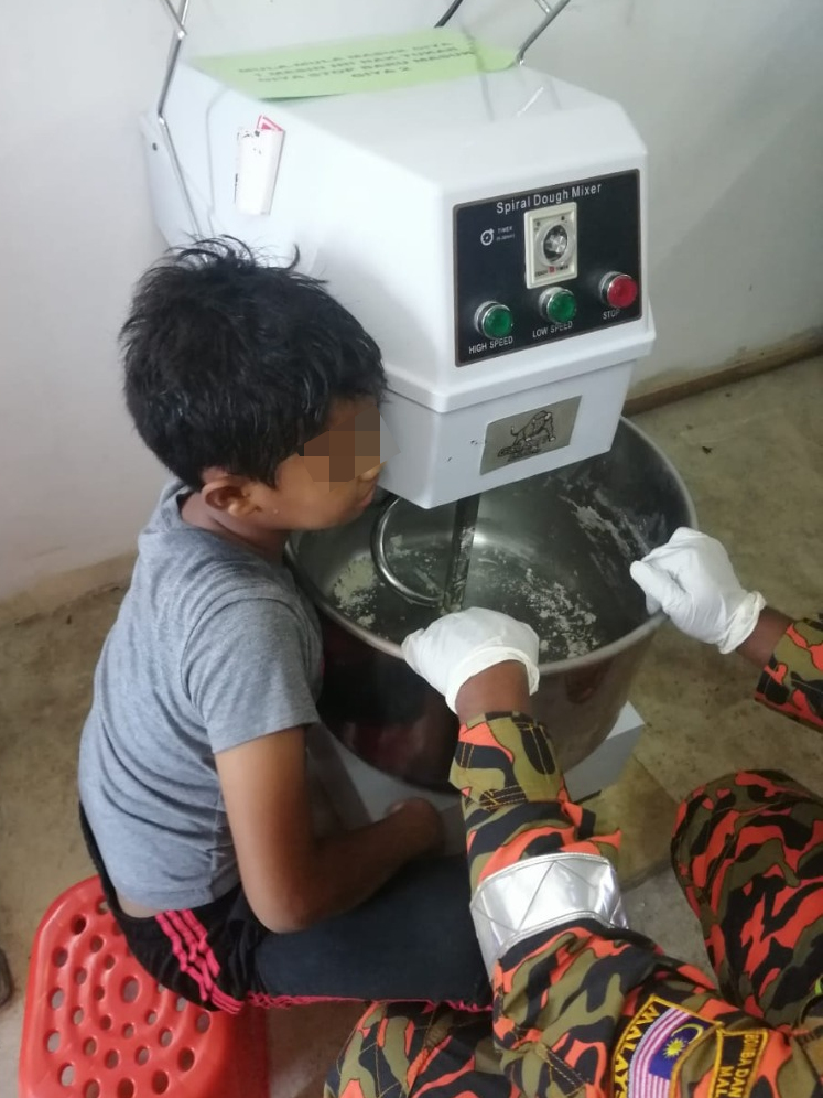 TAIPING: Gara-gara bermain mesin penguli tepung, seorang kanak-kanak lelaki berusia 10 tahun tersepit tangan kirinya pada mesin tersebut dalam kejadian di Markas Pas, Pintu Gerbang Sungai Petai, Bukit Gantang dekat sini, hari ini.