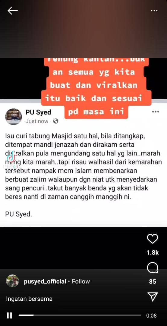 Menerusi akaun rasmi Instagramnya, Syed Mohd. Bakri yang juga Pencetus Ummah berkata, tidak perlu menviralkan video seperti itu kerana dikuhuatiri jika ada yang salah faham terhadap tindakan tersebut.