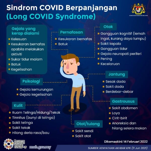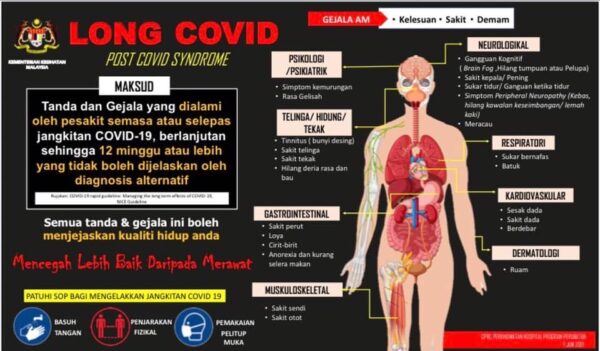 Sebagai rekod, bekas pesakit Covid-19 yang mengalami gejala-gejala berterusan lebih 12 minggu selepas sembuh tanpa mempunyai sebab yang ketara boleh diklasifikasikan sebagai sindrom Long Covid.