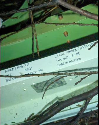 Bagaimanapun, dia tertarik melihat nombor siri palam pintu pesawat dan butiran pembuatannya nampaknya ditulis tangan di pintu dengan pen penanda.