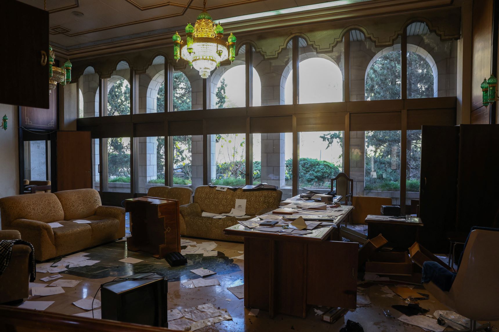 Rakaman foto menunjukkan kediaman Bashar di Istana Tishrin, di al-Muhajirin bersepah, kabinet dan rak buku kosong, lukisan serta barangan peribadi berselerakan di lantai.