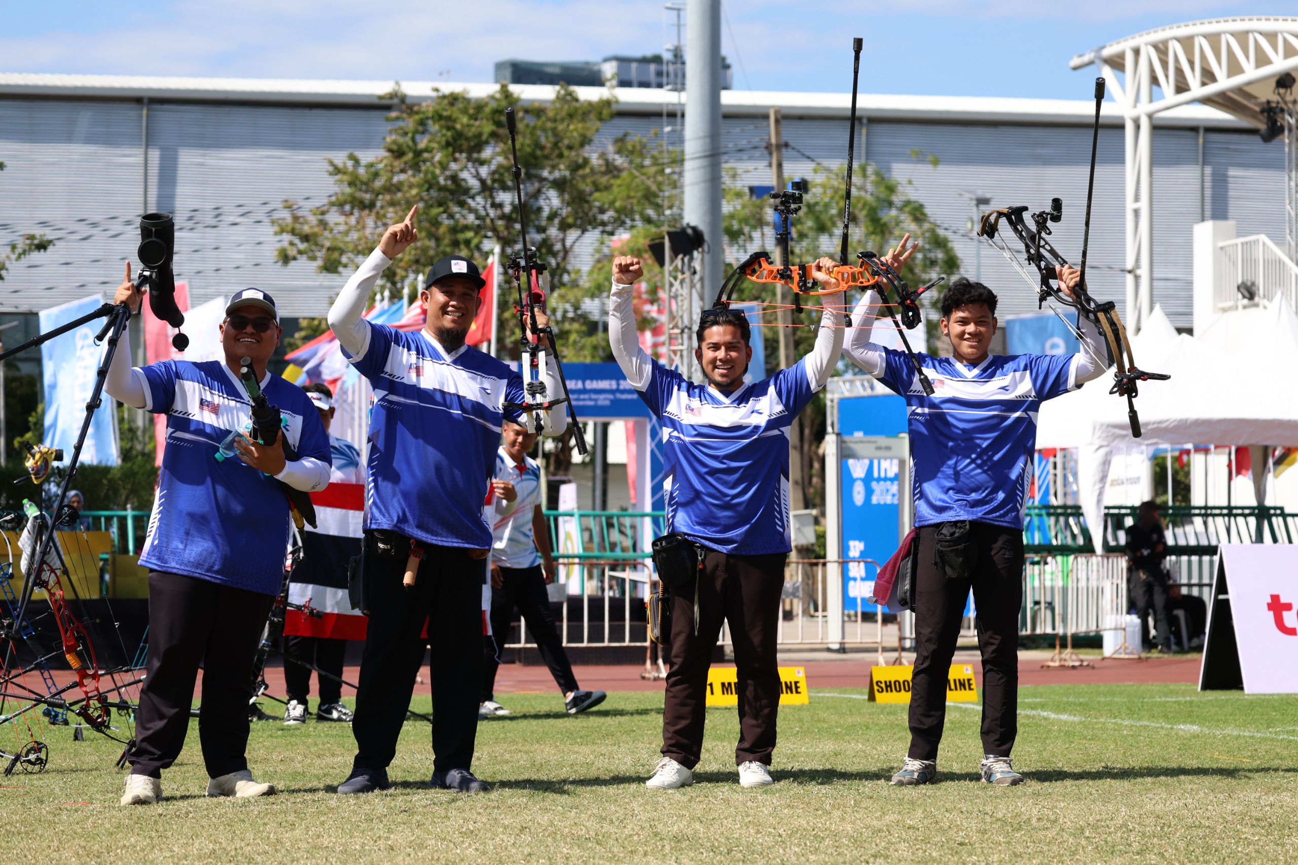 BANGKOK: Skuad memanah negara meraih emas acara compaund berpasukan lelaki di Sukan SEA Thailand 2025 di Lapang Sasar Memanah, Sport Authority Thailand, sebentar tadi.