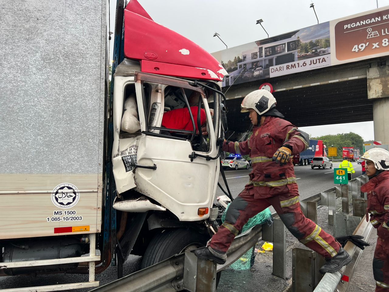 PETALING JAYA: Seorang lelaki cedera akibat tersepit selepas terlibat kemalangan membabitkan dua buah lori di Kilometer (KM) 441 Lebuh Raya Utara-Selatan, menghala ke selatan, hari ini.
