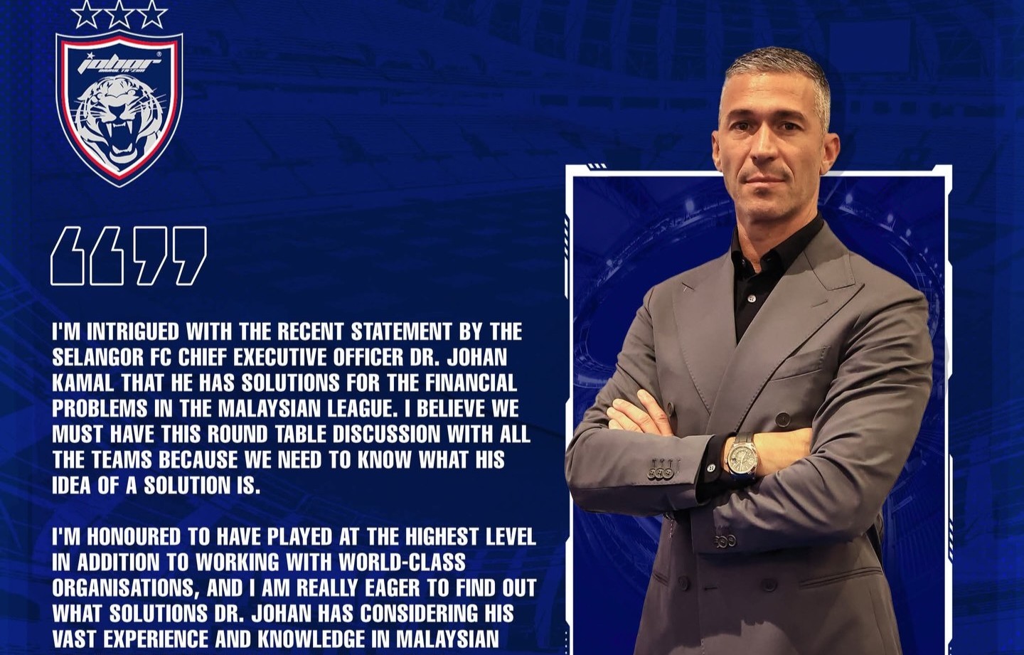 “Saya tertarik dengan kenyataan Dr. Johan Kamal bahawa beliau mempunyai penyelesaian kepada masalah kewangan dalam Liga Malaysia. Saya percaya kita wajar mengadakan sesi perbincangan ini bersama semua pasukan bagi mengetahui dan meneliti idea tersebut,” katanya dalam satu kenyataan di laman sosial Johor Southern Tigers.