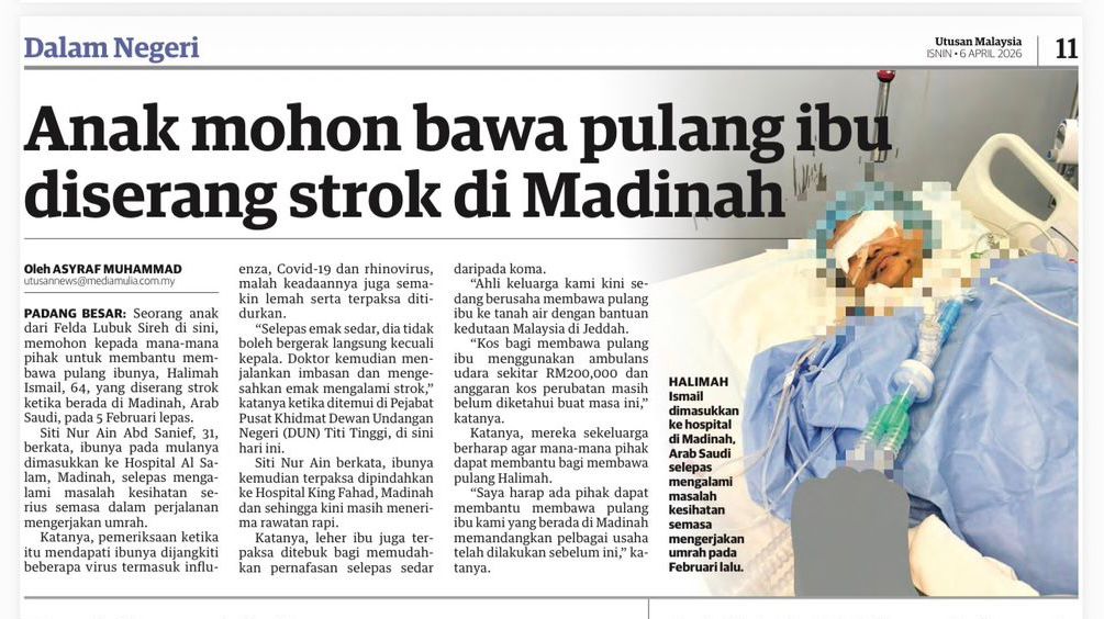 KANGAR: Hasrat keluarga membawa pulang Halimah Ismail,64, yang diserang strok semasa dalam perjalanan mengerjakan umrah di Madinah Februari lalu tidak kesampaian apabila warga emas itu meninggal dunia semalam. Halimah dilaporkan meninggal dunia di Hospital King Fahad, Madinah, pada pukul 3.34 petang. Anak ketiganya, Siti Nur Ain Abd Sanief, 31, berkata, ibu sepatutnya dibawa pulang ke tanah air semalam namun perancangan tersebut terpaksa dibatalkan selepas doktor mendapati keadaan kesihatan semakin merosot…